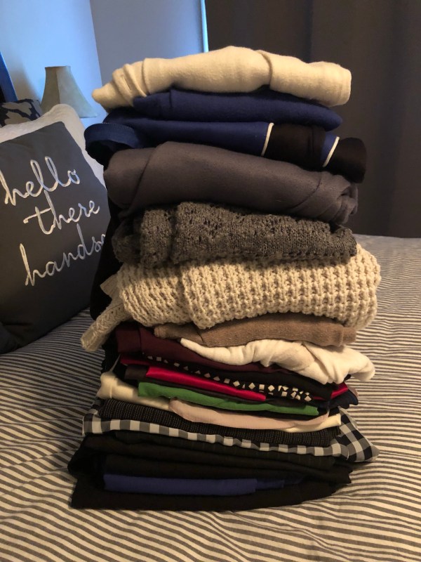 This month I’m giving away several sweaters and what’s left of my business casual pieces: some cardigans, skirts, blouses, and dress pants. I had been hanging on to these things “just in case” [which is by far my most frequent excuse for hoarding things I never use, by the way].