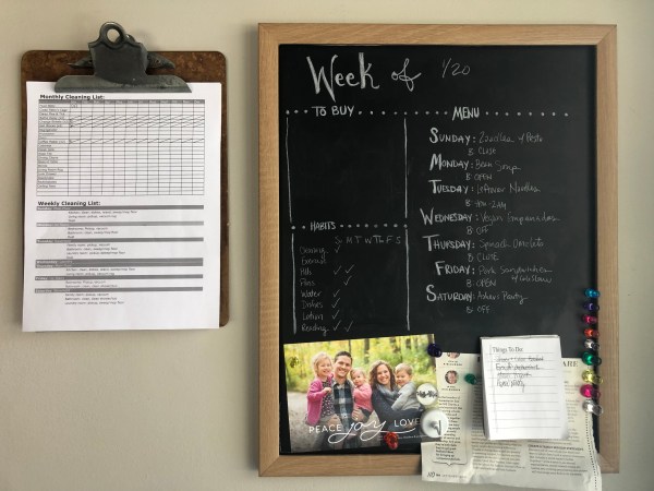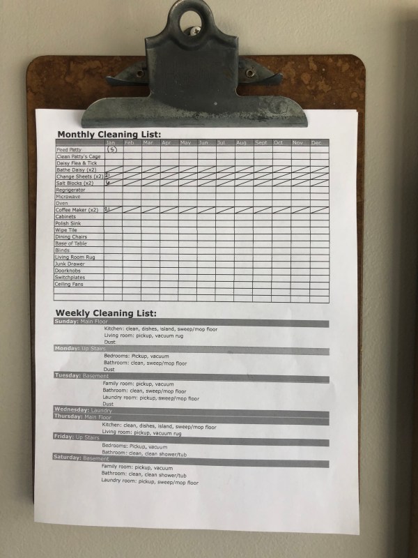 My chores schedule involves a weekly rotation of daily cleaning that equals about an hour a day and covers the whole house twice a week, and also a monthly list of additional things that don’t need to be completed as frequently.