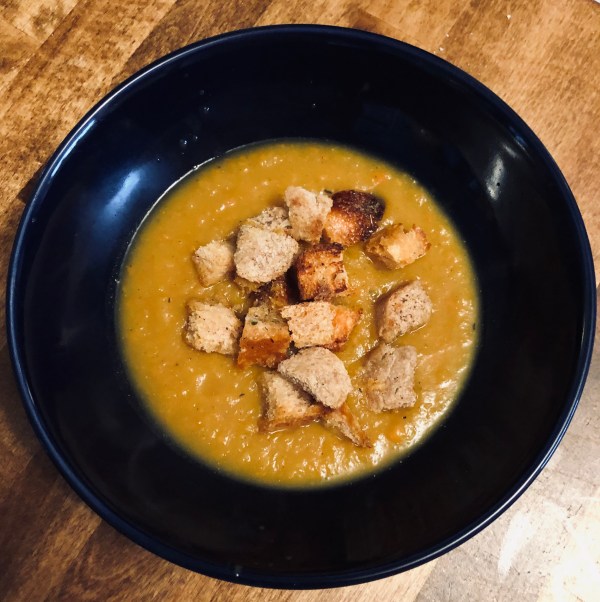 For dinner tonight I had day old bread that needed to be used up, so I made grilled cheese sandwiches and used the ends of the loaf to make these croutons to top squash soup which my Auntie Paula had given us.