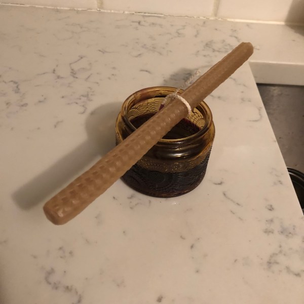Voila! New candle cooling down as we speak. [Yeah, I used a beeswax candle to hold the wick – it’s what I had handy.]