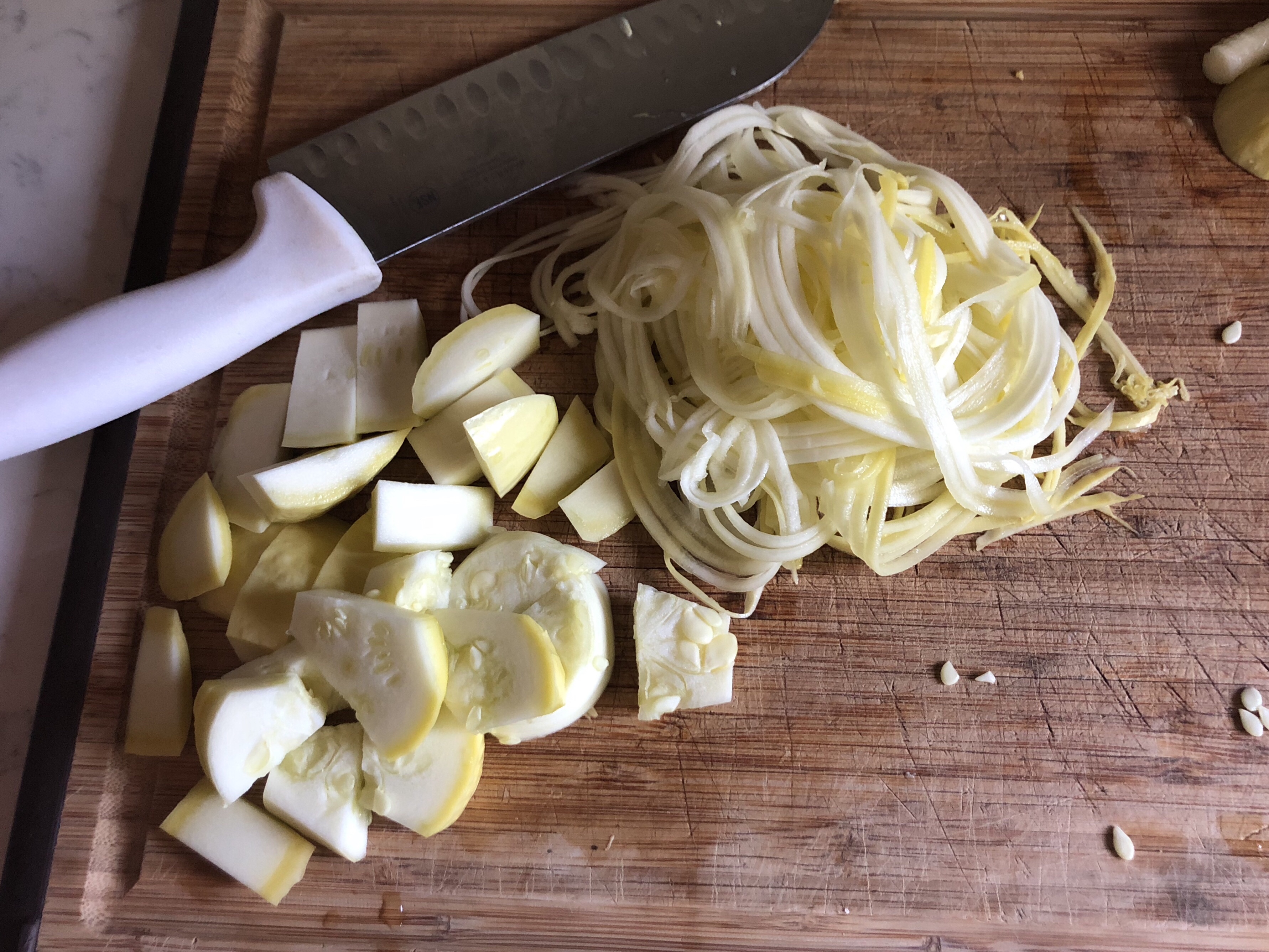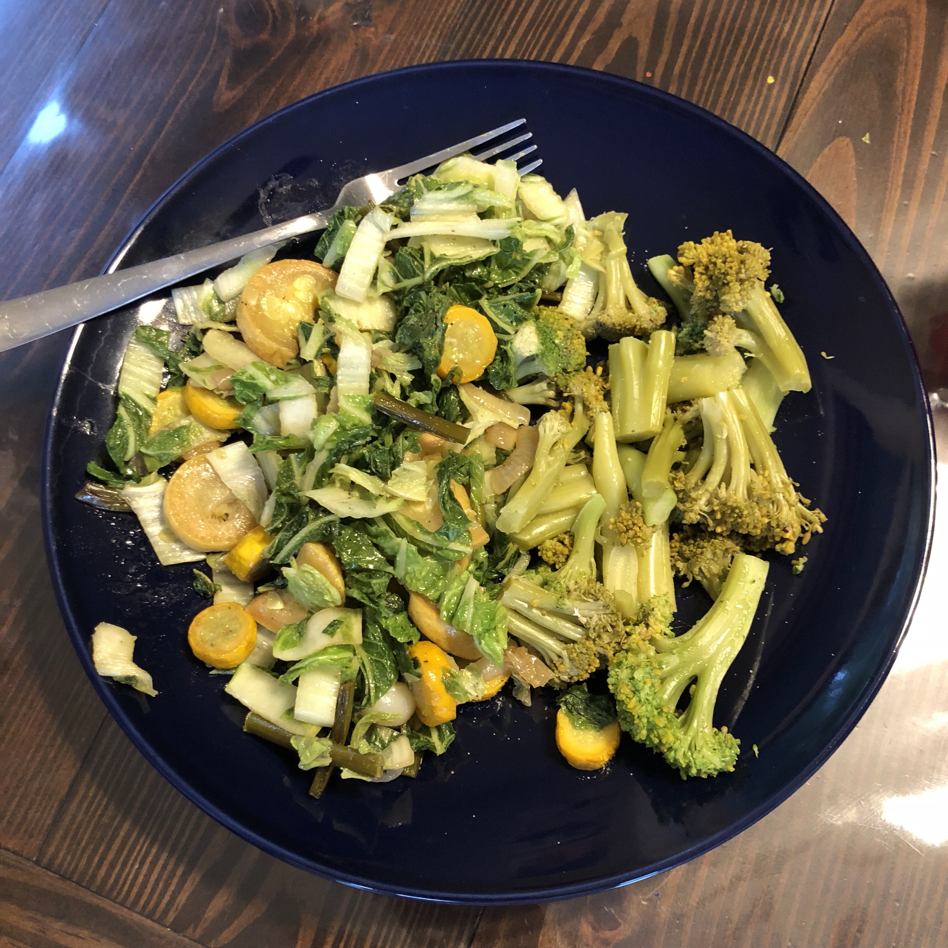 This is a vegan skillet that Brett made using rice, apples, onions, Swiss chard, and some seasonings. He stuffed it into roasted delicata squashes. If this sounds strange to you, it did to me too, but it was delicious. That night, the whole family was vegan and I think we should get bonus points because not a single food was processed.