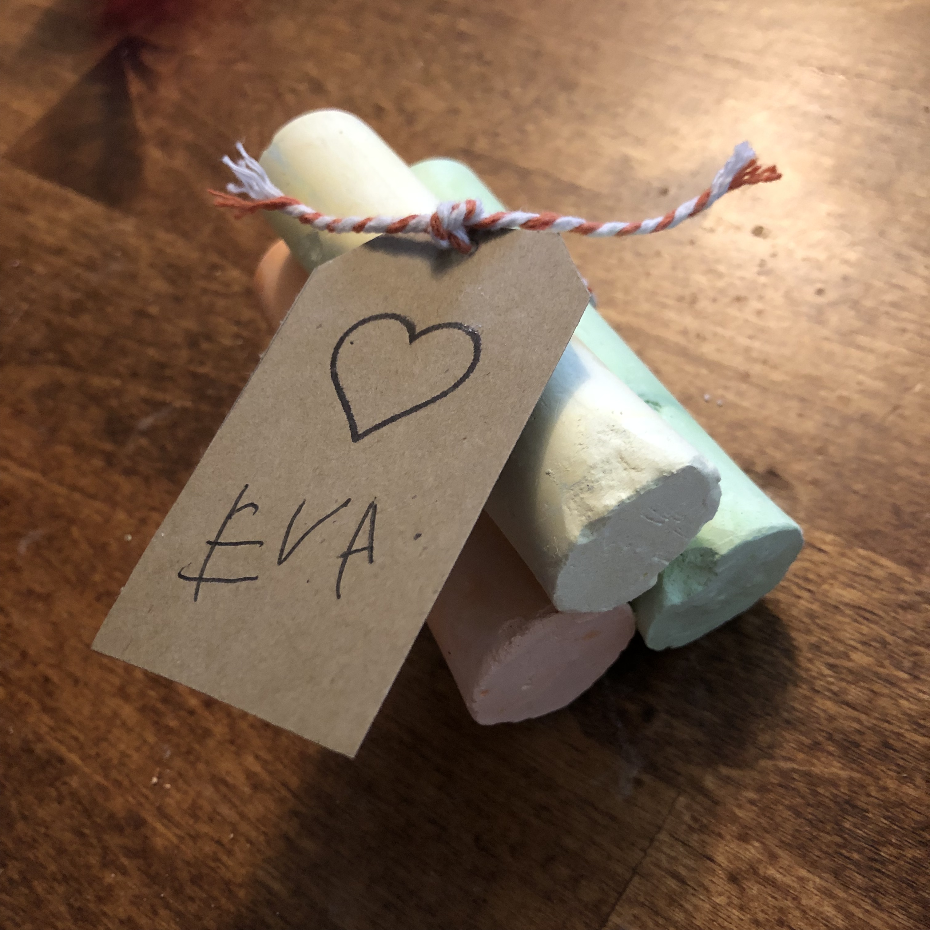 I figured that these could be purchased in cardboard boxes and tied with string. And what child doesn’t love sidewalk chalk?