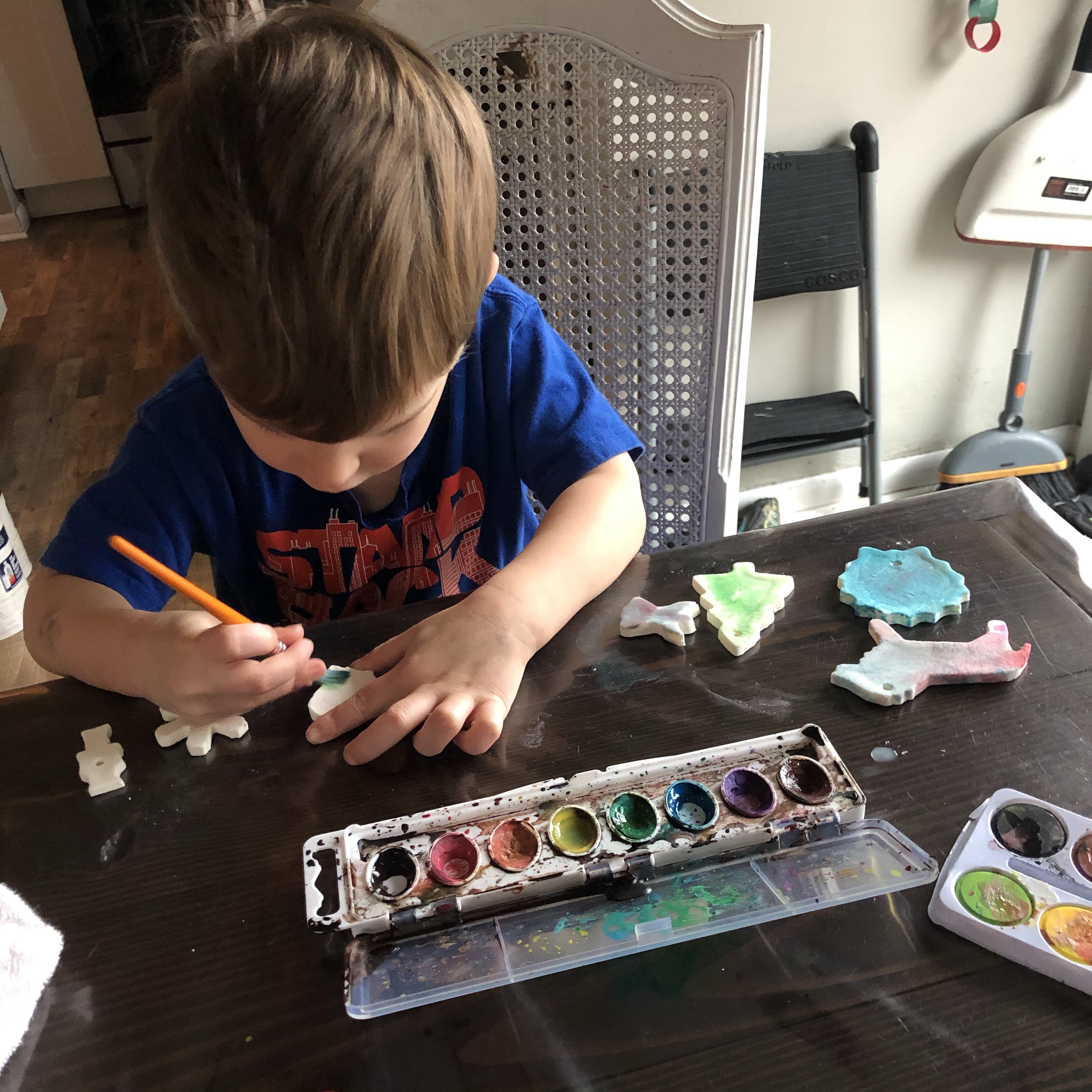 4. We make ornaments to give to friends and family. We’ve done different kinds of ornaments – salt dough, paper, clay, etc. We tried mailing clay ornaments to the cousins one year. That was a bad idea. The next year we sent Danish paper heart ornaments. This year we made corn starch ornaments and will give them to local friends and family.