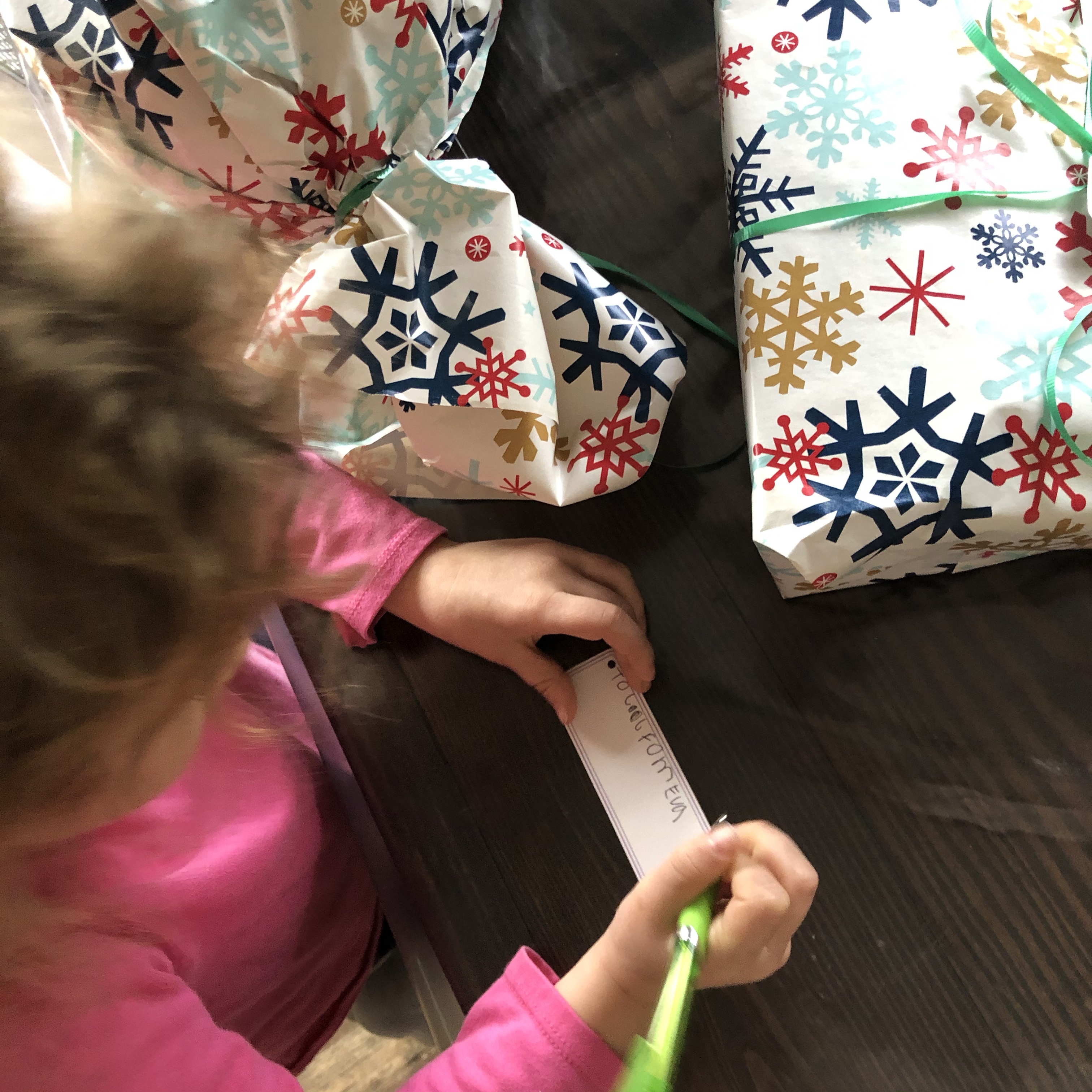 Later I wrap the gifts with each child. My 3-year-old son wanted to put a message on the gift tags so he dictated these sweet notes for his sisters.