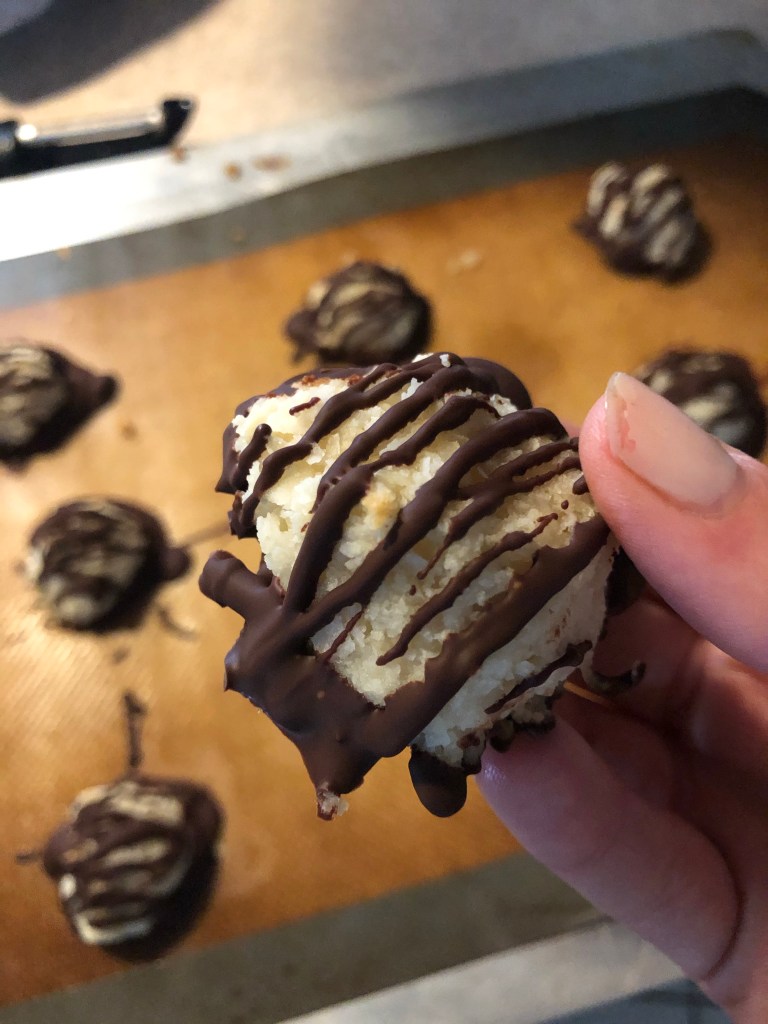 Over at mindfulavocado.com, Amanda provided a super simple macaroon recipe, which I now use to satisfy all my coconut cravings. You can find the full recipe here, but I did modify this one to make it even more simple. Basically, all I do is mix together sweetened coconut flakes [you could pulse in a blender to make them finer, if you prefer], almond flour, maple syrup, a pinch of salt and enough almond milk to make it come together into a thick “batter” of sorts. Then I spoon it onto my silicone baking mat in little ball shapes and bake them at 275° for about 30 minutes [sometimes longer, check frequently.] Then once they are cooled, I dip and drizzle with melted dark chocolate chips.