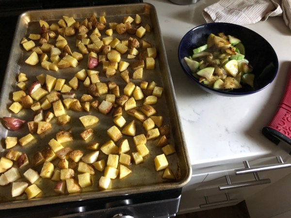 I was considering preparing eggplant as well, but I realized that the potatoes and squash provided plenty of food [there was even enough for leftovers].