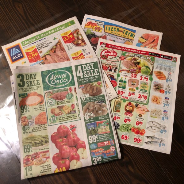 Rather than creating a meal plan and then buying the ingredients regardless of the price, I let the weekly ads determine what we eat each week. In my area, each Wednesday, grocery stores roll out new ads with new deals. I compare the ads from four different local grocers and then choose the one [or maybe two] with the best sales and that’s where I’ll be shopping that week.