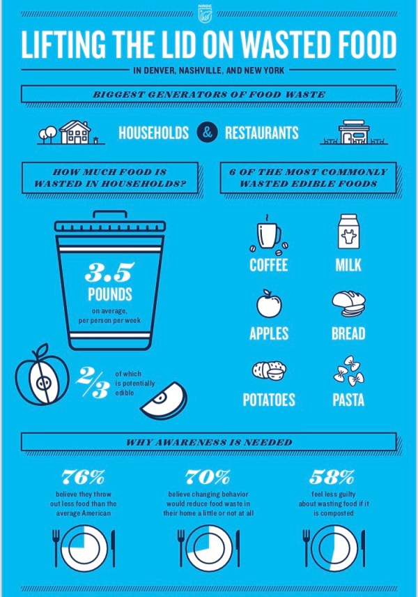 And before you go blaming it all on grocery stores, this infographic created by the NRDC says that households and restaurants are the biggest generators of food waste [at least in Denver, Nashville and New York].