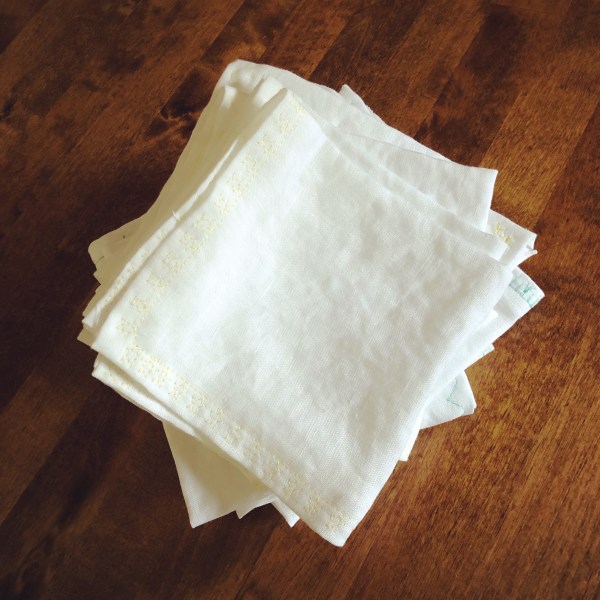 I haven’t bought tissues in my adult life – other than picking up a box before my dad comes to visit and buying a box this fall for my daughter to take to kindergarten. It is probably unusual, but we use toilet paper for nose blowing. I fully blame my partner for this alternative. We currently compost the make-shift tissues, so I guess it’s not a total waste, but I’ve been dying for handkerchiefs. They are reusable, they are soft, and they kinda have this old-fashioned classy feel to them.